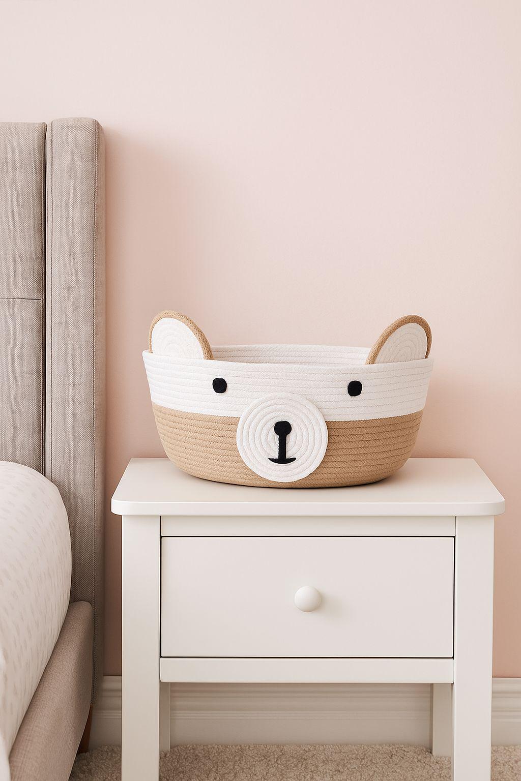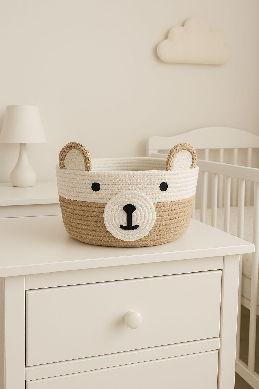 Bring warmth and organization to your little one’s room with this adorable handmade bear-shaped storage basket. Crafted from natural cotton rope in beige and white tones, this cute basket is perfect for storing toys, diapers, clothes, books or any nursery essentials. Its neutral colors blend seamlessly with modern, boho or Scandinavian style décor.