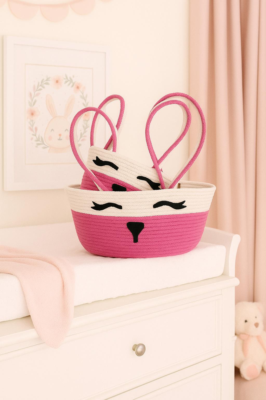 Woven slowly and carefully from soft pink and white cotton rope, each stitch holds a bit of care and intention. It’s more than a basket — it’s a companion for the early days: a place to tuck away tiny clothes, beloved toys and bedtime books. Imagine your child reaching into the sweet bunny ears for their favorite toy, or you placing fresh blankets inside after a long day. Over time, it becomes part of your family’s routine and memories.
